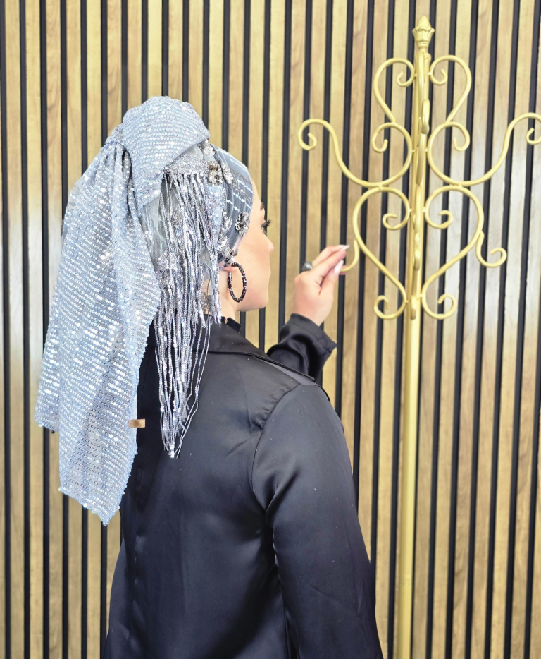 בצד אחד של המטפחת פרנזים  פייטים ארוכים, מיוחדים ומרשימים אשר מעניקים גימור עשיר וחגיגי.