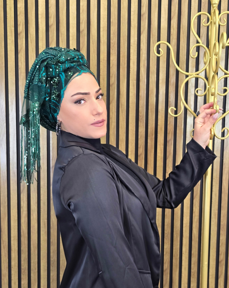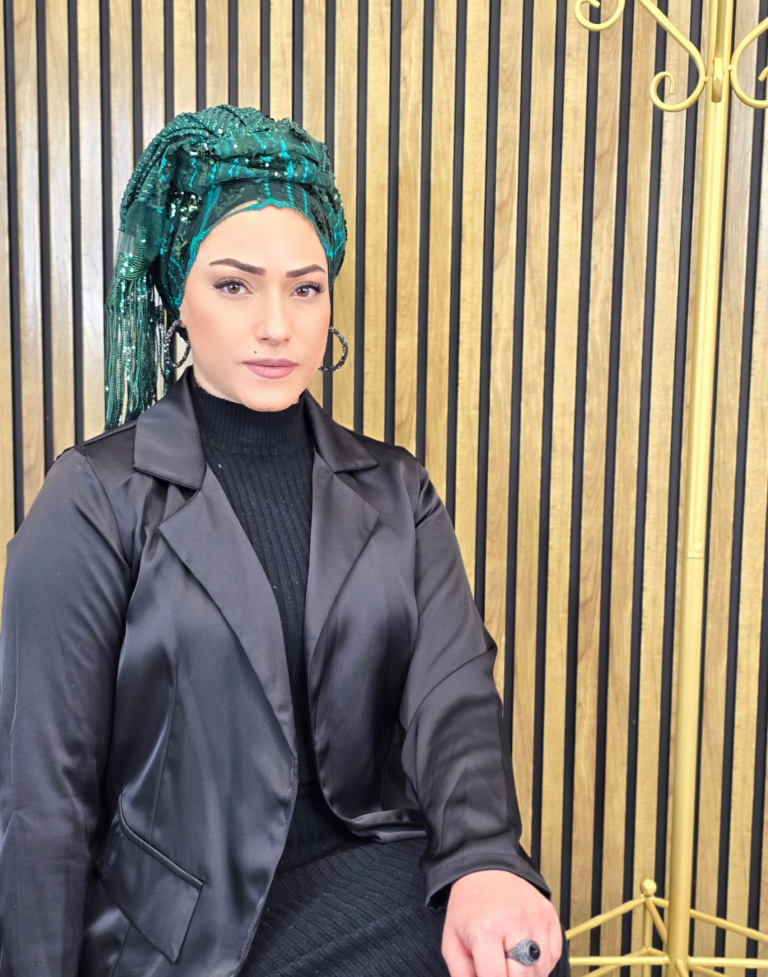 בצד אחד של המטפחת פרנזים פייטים ארוכים, מיוחדים ומרשימים אשר מעניקים גימור עשיר וחגיגי.