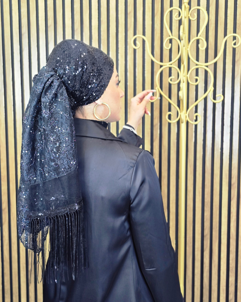 בצד אחד של המטפחת פרנזים  פייטים ארוכים, מיוחדים ומרשימים אשר מעניקים גימור עשיר וחגיגי.