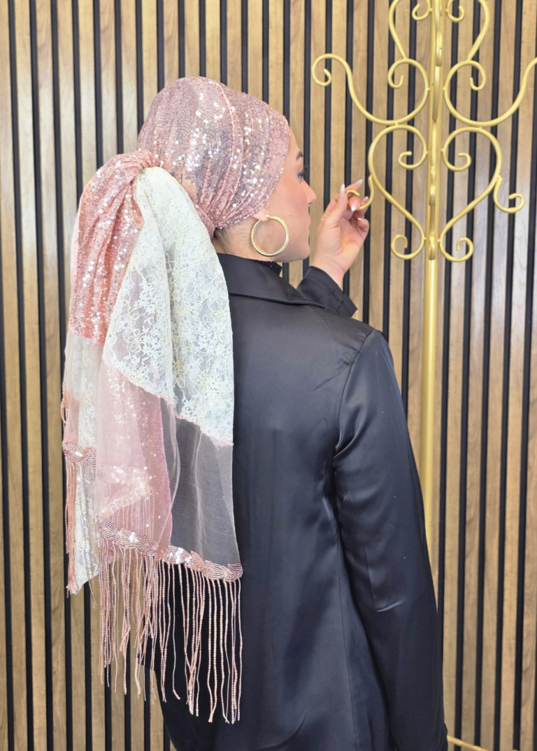 בצד אחד של המטפחת פרנזים פייטים ארוכים, מיוחדים ומרשימים אשר מעניקים גימור עשיר וחגיגי.