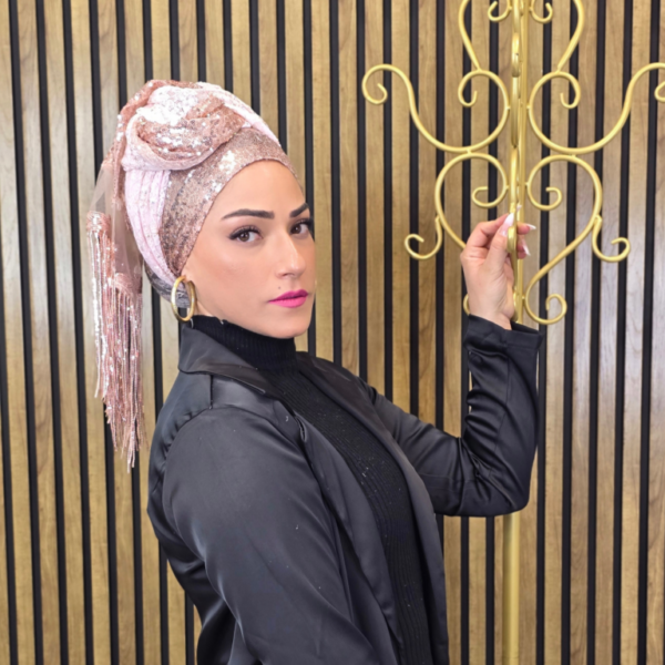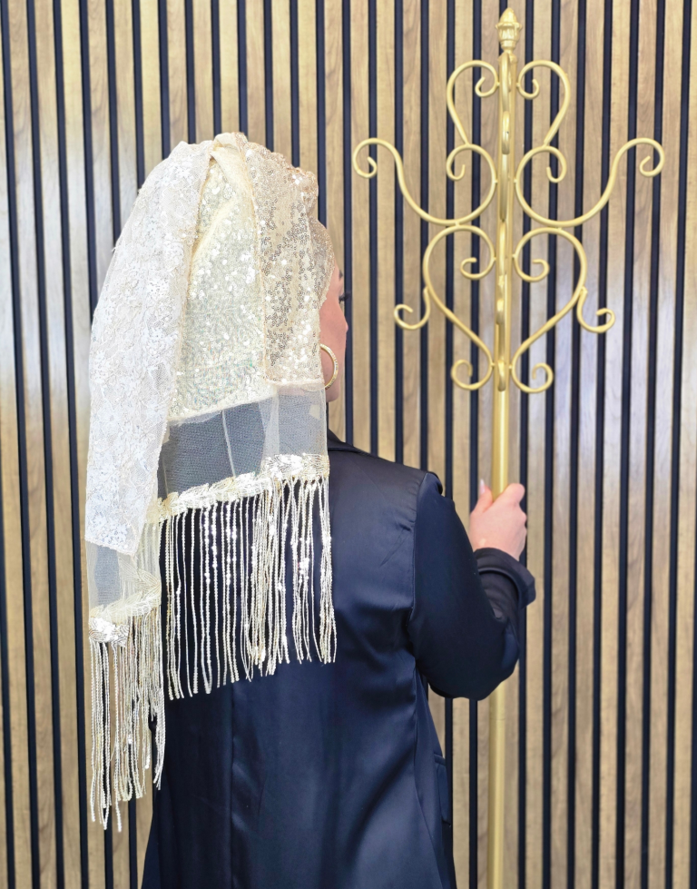 בצד אחד של המטפחת פרנזים פייטים ארוכים, מיוחדים ומרשימים אשר מעניקים גימור עשיר וחגיגי.