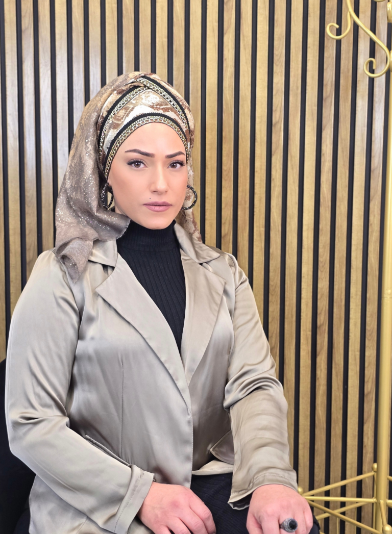 לאורך המטפחת שובל של שרשרת זהב המדגיש את שוליי המטפחת ומעניק לה שיק וסטייל.