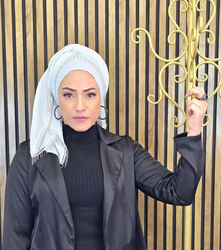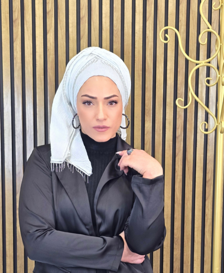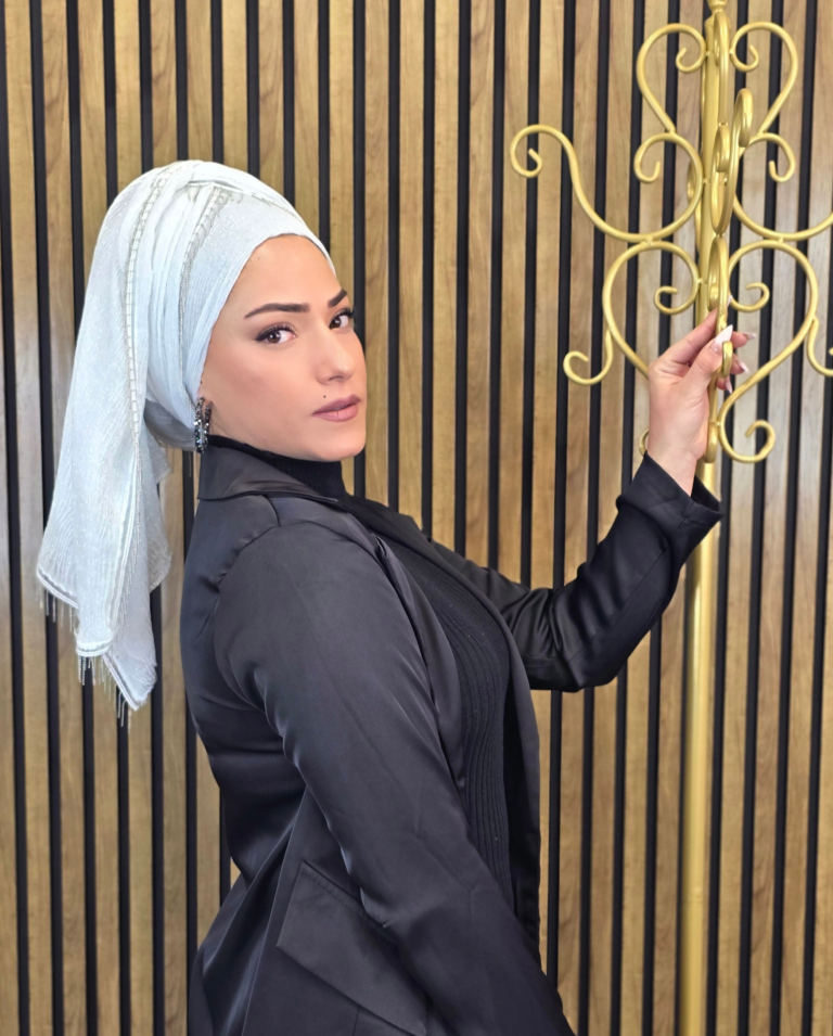 מטפחת צעיף מבד נוח, נעים וקליל לקשירה. לאורך המטפחת שובל של פרנז כסף ומתמשך גם לגימור המטפחת בצד אחד. הפרנזים מדגישים את שוליי המטפחת ומעניקים לה שיק וסטייל.