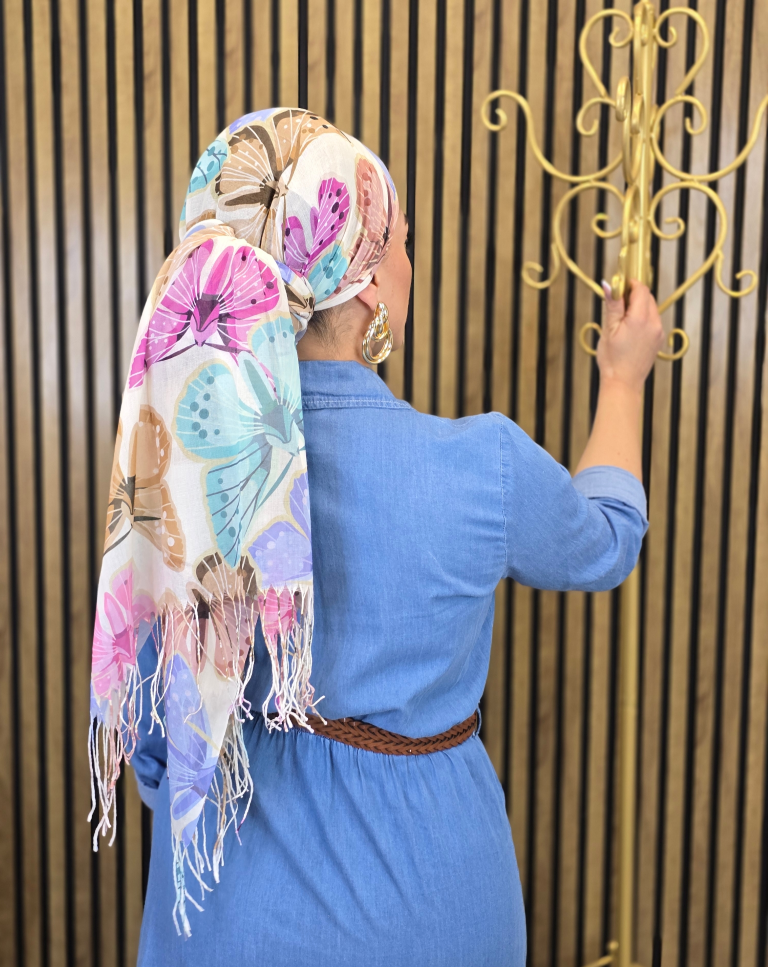 פרפרים ⇐ צעיף מבד כותנה. לא מחליקה, נעימה מאוד למגע ונקשרת על הראש בקלות ובנוחות. בטקסטורת פרפרים צבעונית ומרנינה מלאת צבע ושיק. בקצוות המטפחת פרנזים לעיטור וסיומת יפייפיה.