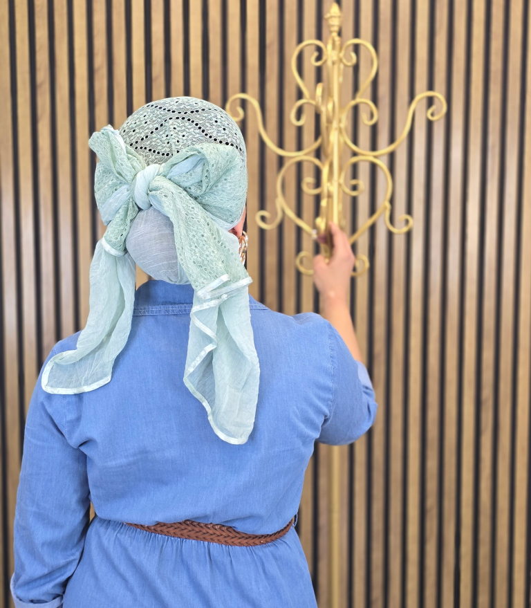 שכבות של סיגנון – מטפחת משולבת מבד תחרה בטקסטורה של פרחים עדינים ובד כותנה עם פס עיטור סאטן סביב המטפחת. למבינות באופנה בלבד !